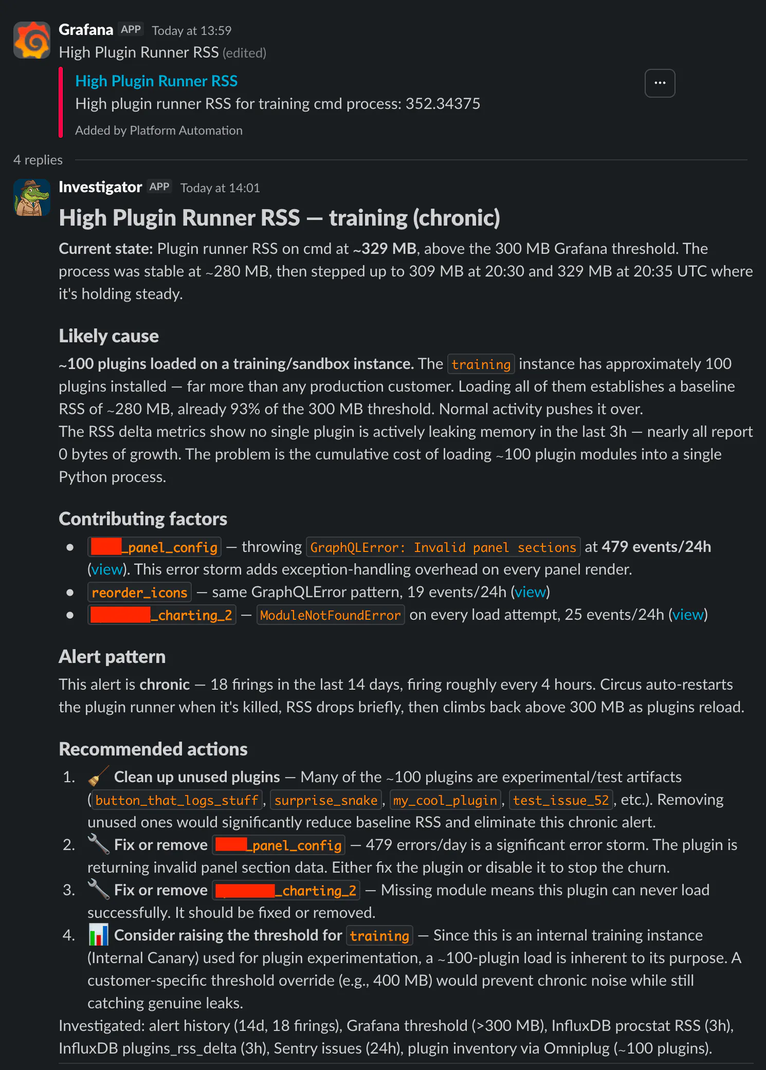 Support Stack proved there was real benefit to agent-based investigation, and it gave me the idea to do the same for our automated alerts. With the Claude Agent SDK I could automatically investigate any alert that came in from our automated monitoring. In the same way that we gave Support Stack access to MCPs, I gave my nascent agent access to tools via APIs. Much of the implementation was the same as Support Stack: local access to code and tools to search it, access to GitHub for searching or creating PRs, access to Sentry, ElasticSearch, and InfluxDB for detailed data about errors, logs, and metrics. I also built some internal APIs to give Investigator context about our applications and our customers’ plugins. Plus some glue to prompt the agent to investigate any new alert that made its way to Slack. These investigations were immediately useful--they provided context far beyond "high CPU usage" or "high memory usage"--Investigator could look at recent web requests and determine what the actual cause was, or see that a customer had uploaded a new version of a plugin immediately before memory usage tripled.